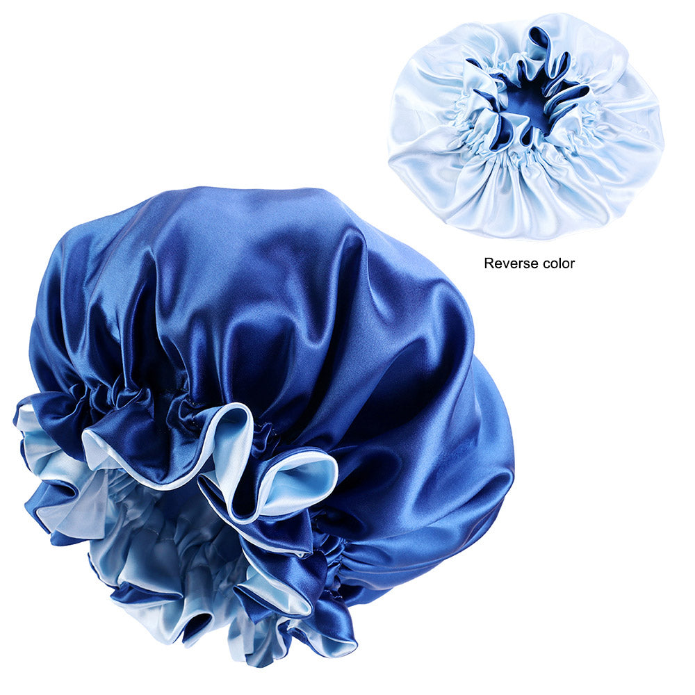 Blauwe satijnen haarbonnet met rand (omkeerbare satijnen nacht slaapmuts)