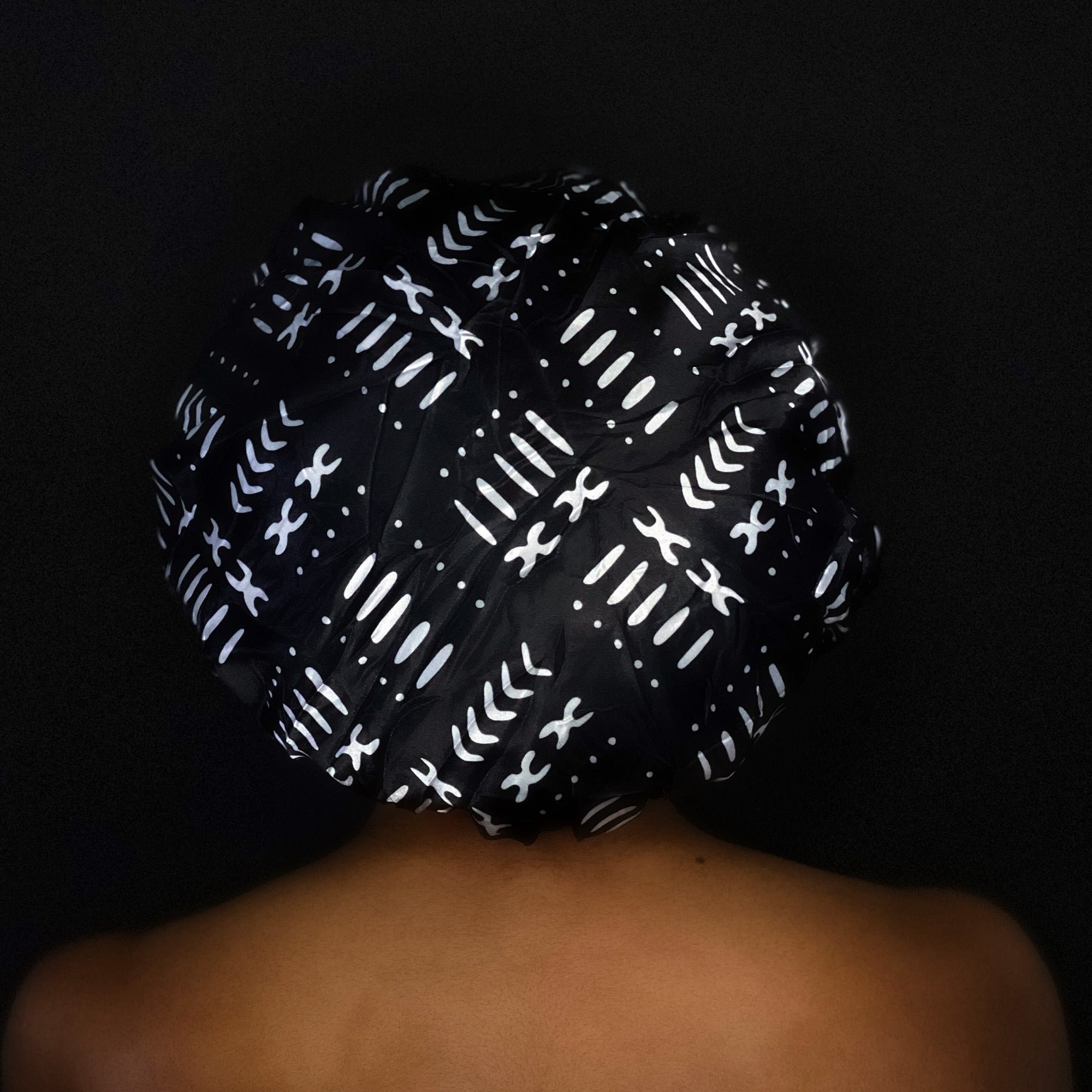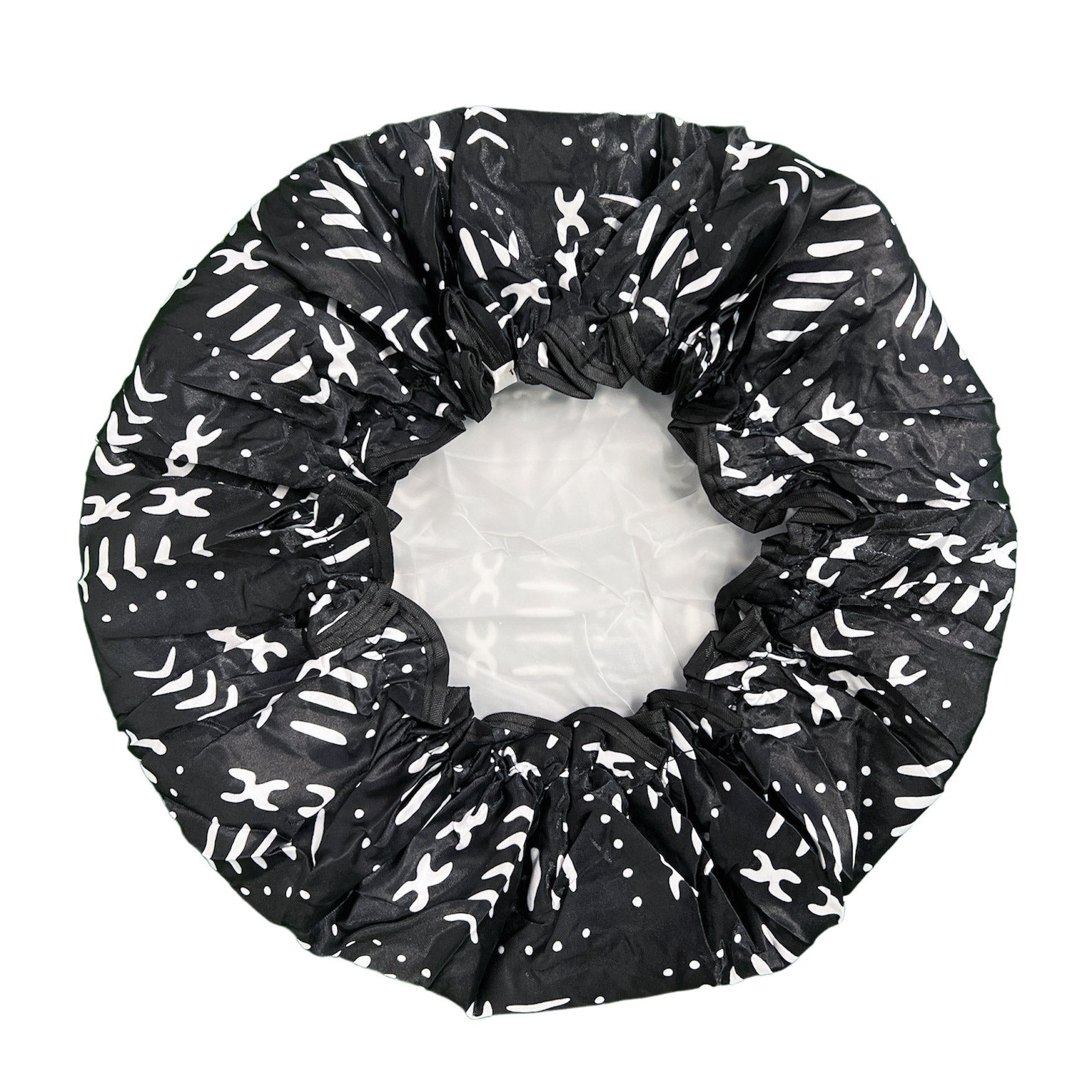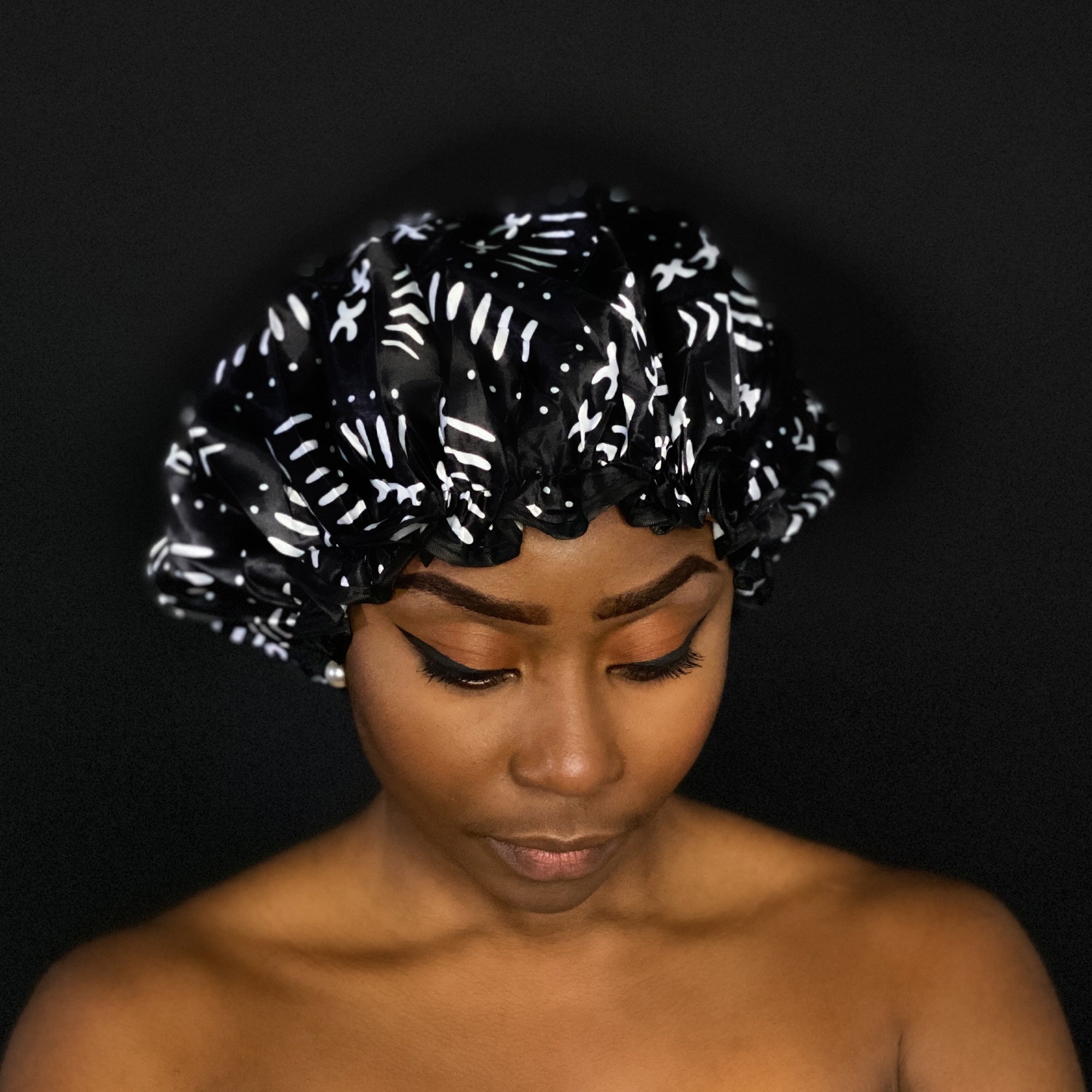 GROTE douchekap voor vol haar / krullen - Afrikaanse print Zwart Wit bogolan